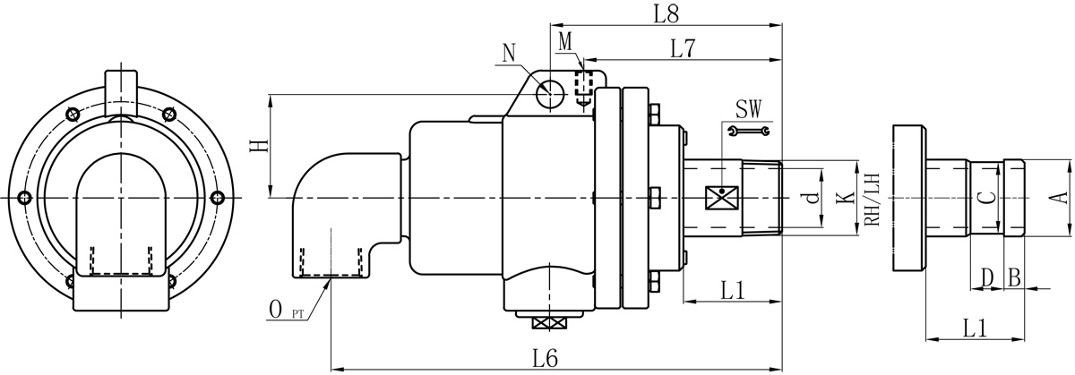| Model | K | O | d | L1 | L6 | L7 | L8 | M | N | H | SW | 法兰式外管尺寸对照表 | |||
